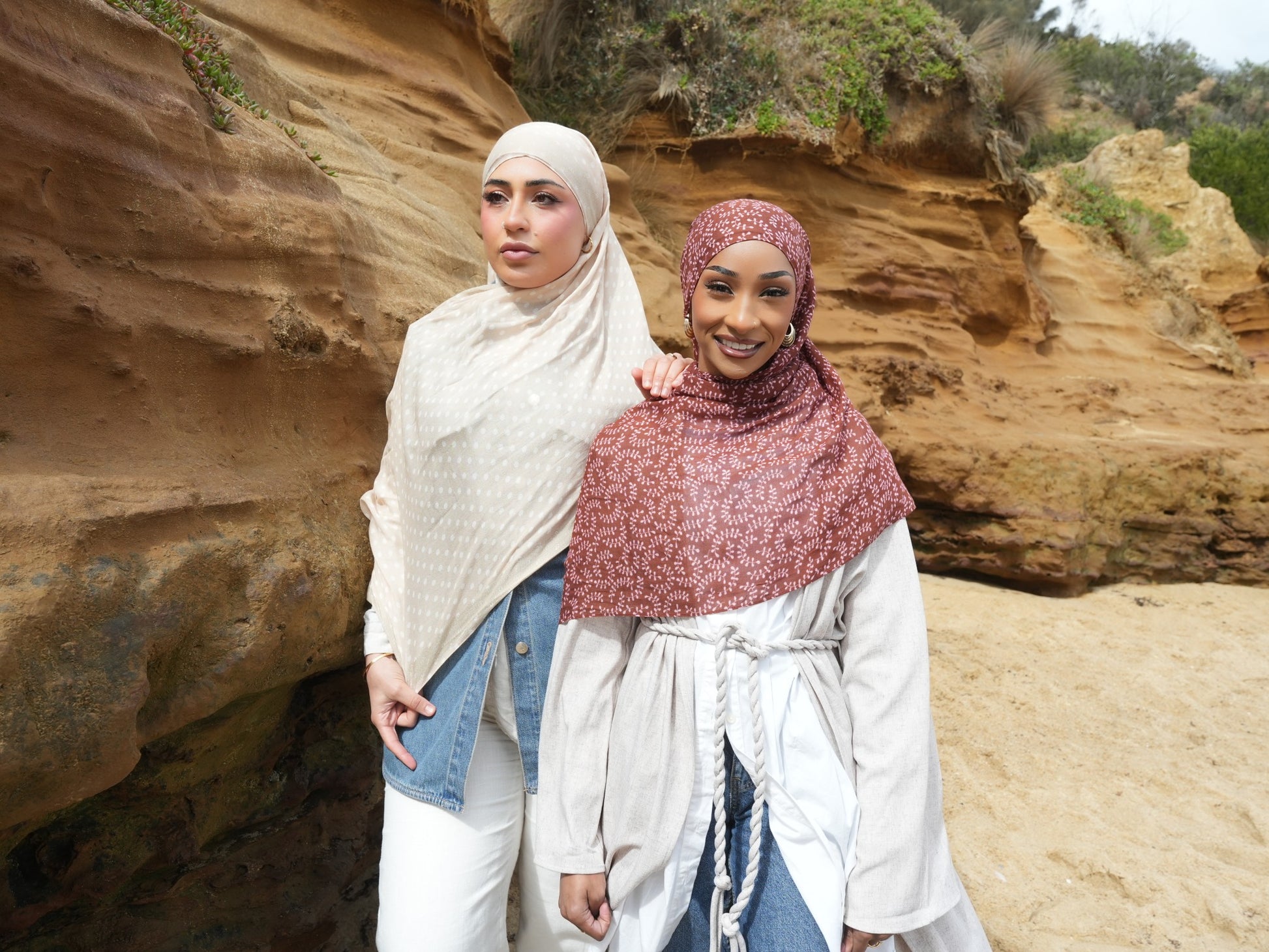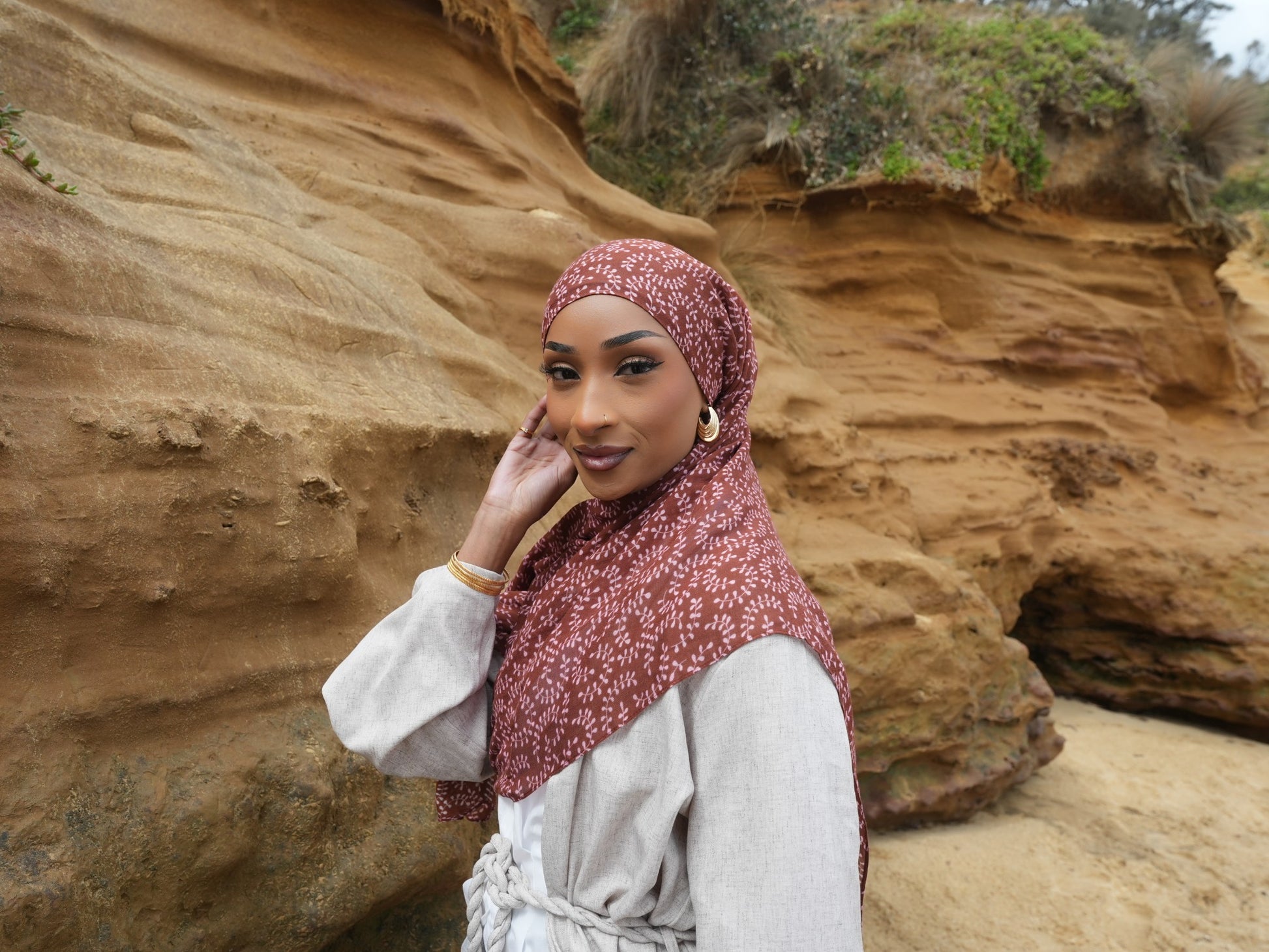 This printed premium modal hijab is inspired by sacred motion of block print and stillness. Like the petals of a rose caught in a gentle whirl, dervish petals draws from the graceful twirl of sufi dancers. One hijab, two wears - one side in pink and deep brown, the other in warm brown with soft ivory/beige petals. Designed to compliment wardrobe staples.